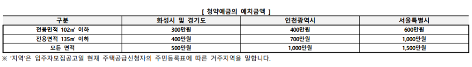 - 입주자 저축통장 가입기간 12개월 이상이며, 지역별 면적별 청약예치금 충족하는자