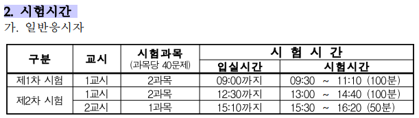 ㅇ 1차시험 1교시(2과목) 100분(09:30~11:10)