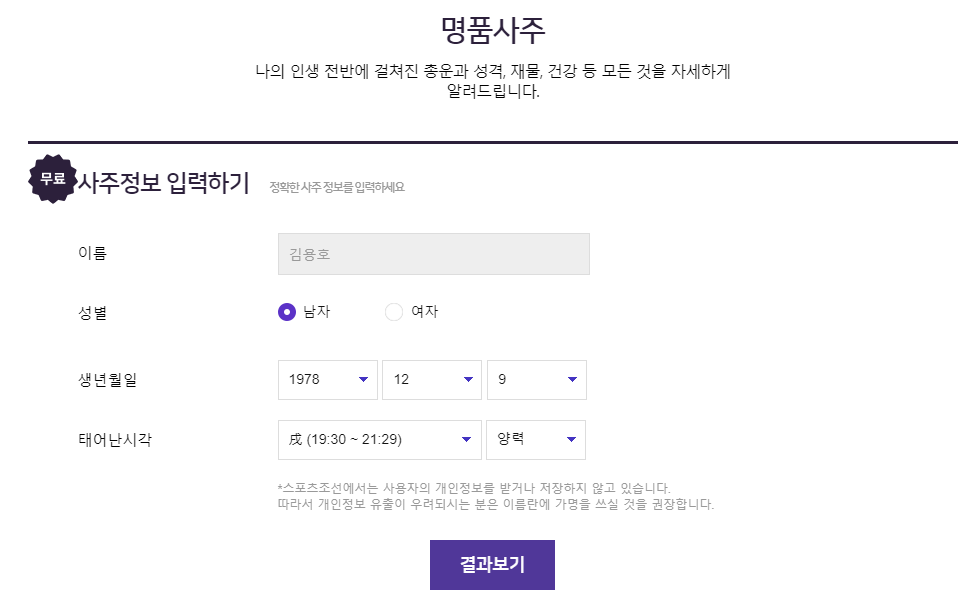 ㅇ 기본정보(성별, 생년월일, 태어난 시)만 입력하면 간편하게 조회 가능합니다.